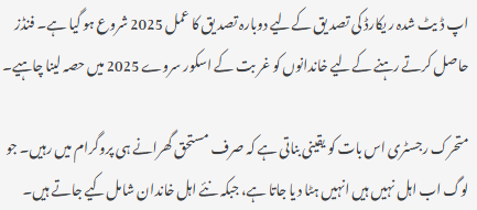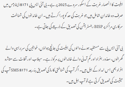 Eligibility depends on the poverty score survey 2025. Only families who meet the poverty threshold are included in the BISP 8171 database. These families are identified through BISP registration verification at official centers.
