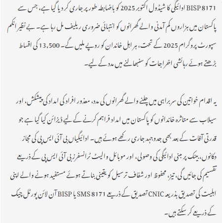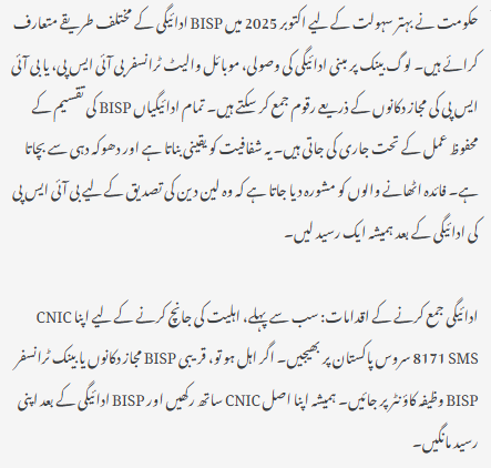 | October 2025 | Rs. 13,500 installment | Bank transfer BISP stipend, mobile wallet transfers BISP, shop-based BISP payments | 10th Oct – 30th Oct |
